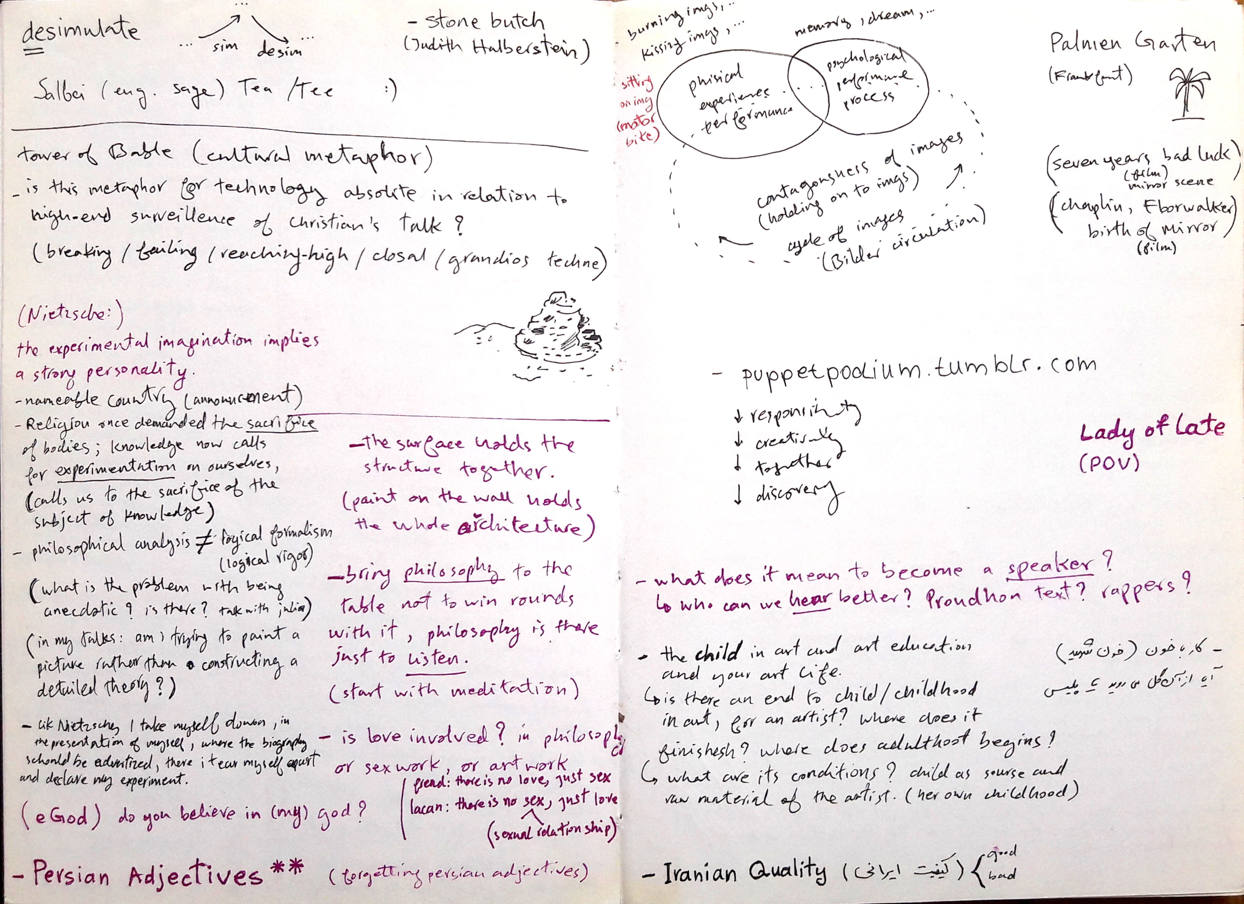 desimulate, tower of Babel, Nietsche, nameable country, religion sacrifice, science experimentation, anecdotic, my talks are paining a picture rather that constructing a detailed theory, biography advertized, Persian Adjectives, contagiousness of images, Lady of Late, what does it mean to become a speaker? who can we hear better? child, Iranian Quality keyfiat-e irani, khun-e shahid