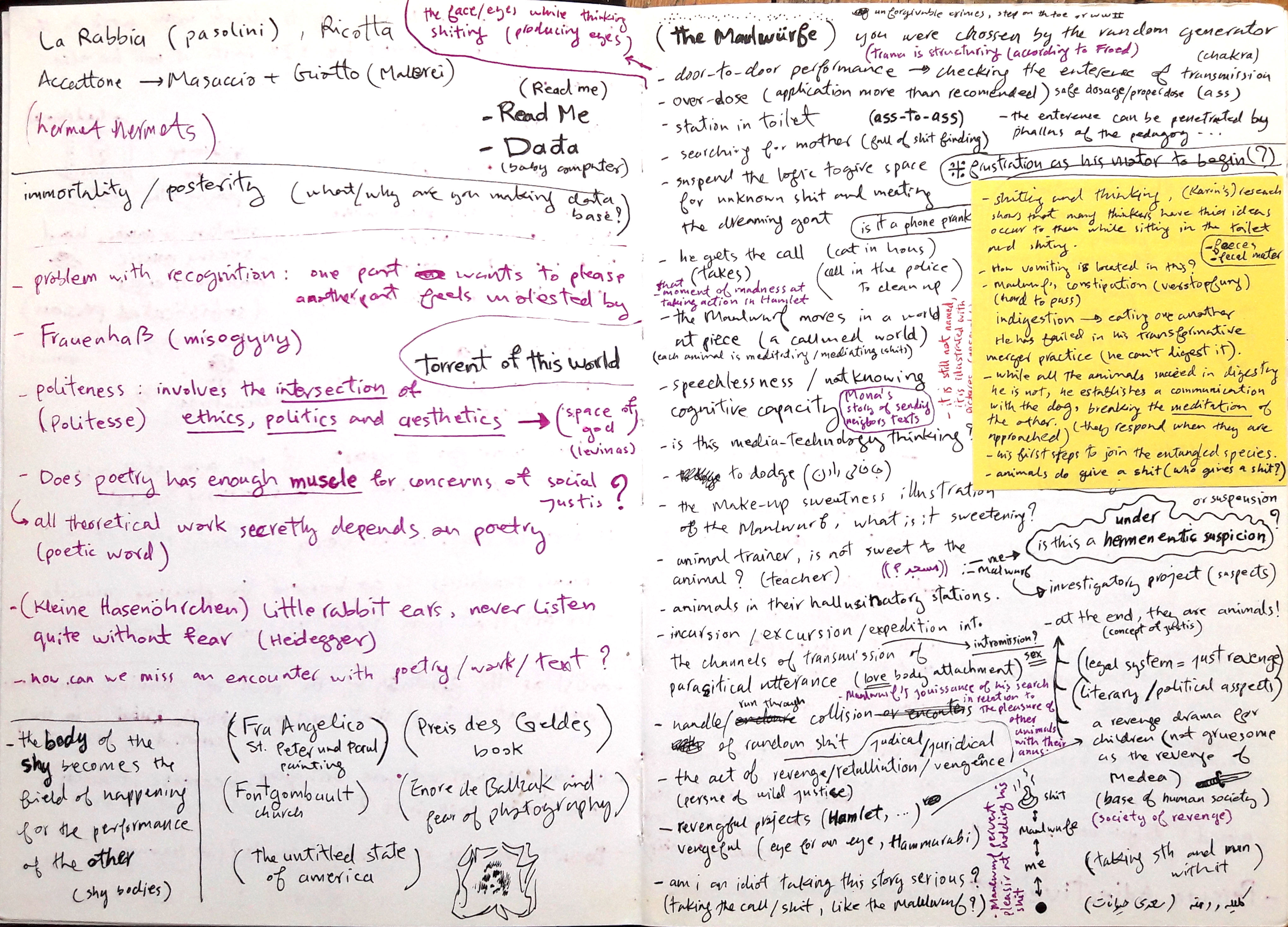 da(d)ta (data + dada), politeness, poetry muscle for social justice, Heidegger's little rabbit ears, the body of the shy becomes the field of happening of the other, the untitled state of America. Maulwurf, under hermeneutic suspicion, Hamlet, Medea, revenge, animal trainer, ass-to-ass,